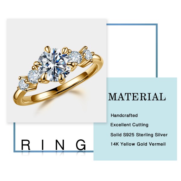MOOSEA 这款五石圆形莫桑银戒指,以 925 纯银为基底,搭配 14K 黄金镀金工艺,打造出层次分明的双色质感;五颗圆形莫桑石紧密排布,切工精湛,火彩璀璨媲美钻石,抬手间尽显轻奢精致感。